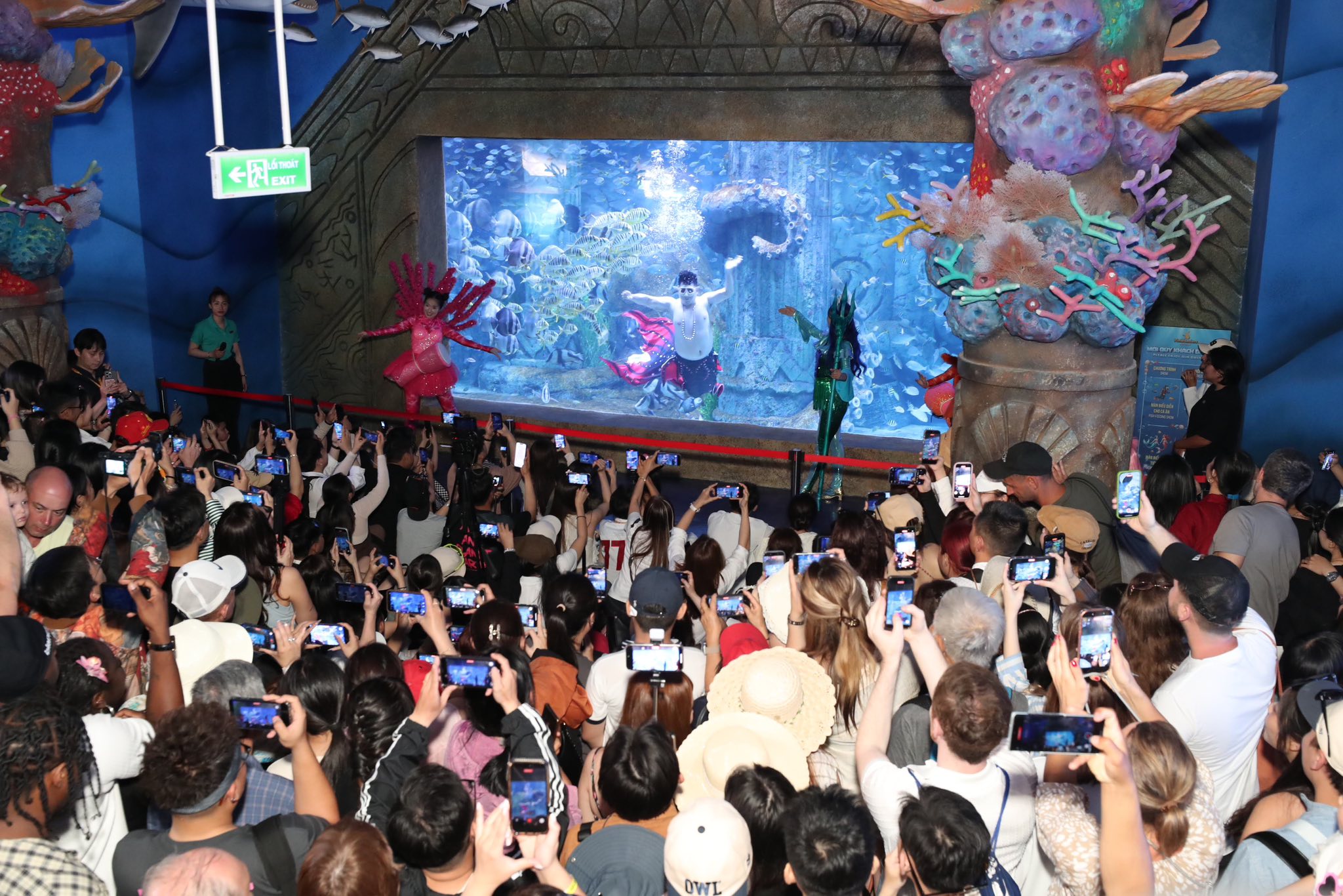 Không khí sôi động tại khu biểu diễn thủy cung vào ngày mồng 4 Tết khi hàng trăm du khách hào hứng ghi lại màn trình diễn nàng tiên cá đầy sắc màu dưới làn nước xanh huyền ảo. Nguồn: Facebook VinWonders Nha Trang