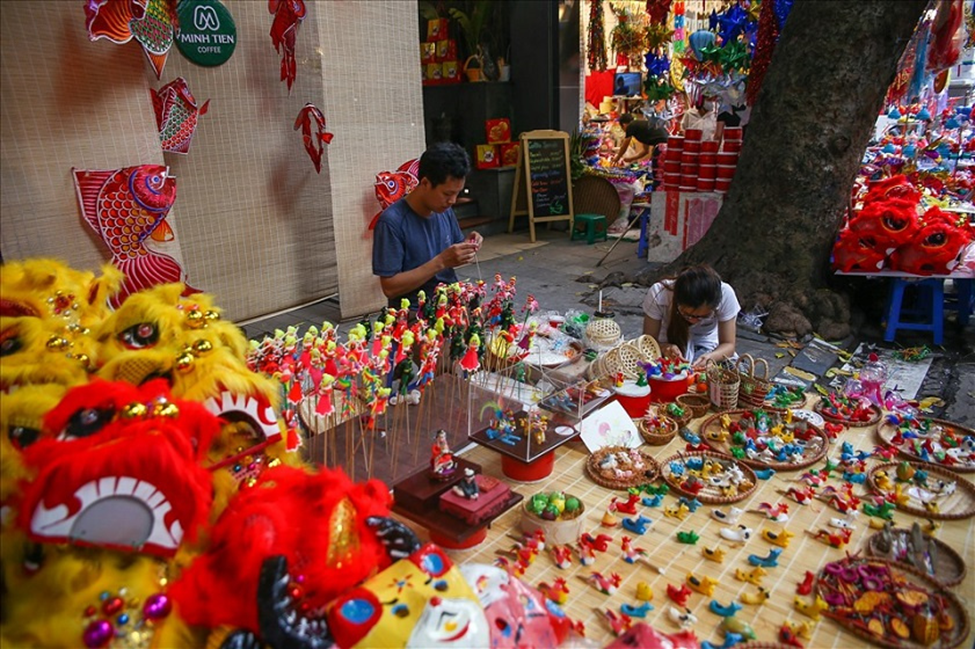 Nếu muốn cảm nhận trọn vẹn không khí ấy, hãy đến phố Hàng Mã – “linh hồn” của mùa lễ hội. Cả con phố như rực sáng trong muôn sắc màu: từ đèn lồng giấy, mặt nạ truyền thống, đến đèn ông sao, trống tầm vông.