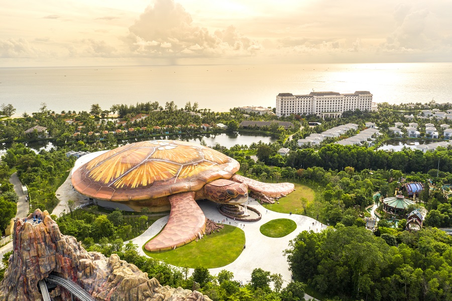 Thủy cung của VinWonders Phú Quốc được xây theo hình rùa đồi mồi khổng lồ, vừa là biểu tượng độc đáo, vừa tạo nên không gian đại dương huyền ảo.