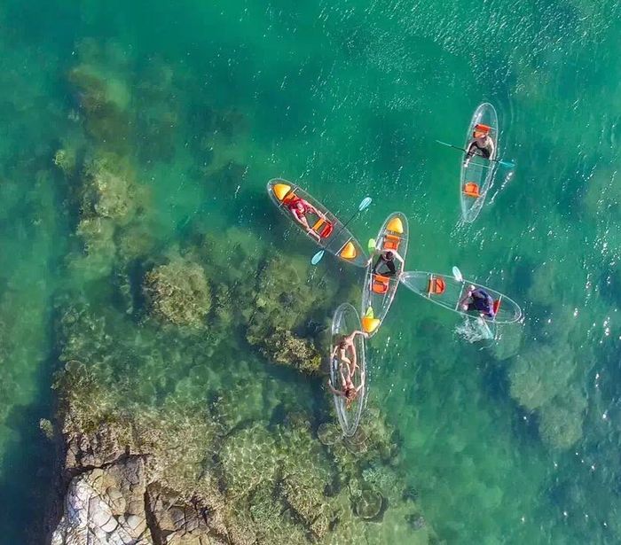 Chèo kayak trong suốt ở Hòn Mun, du khách vừa lướt nhẹ trên mặt biển, vừa ngắm nhìn những rạn san hô ẩn hiện ngay bên dưới, tạo nên trải nghiệm mùa hè đầy mới lạ và khó quên. Nguồn: Internet