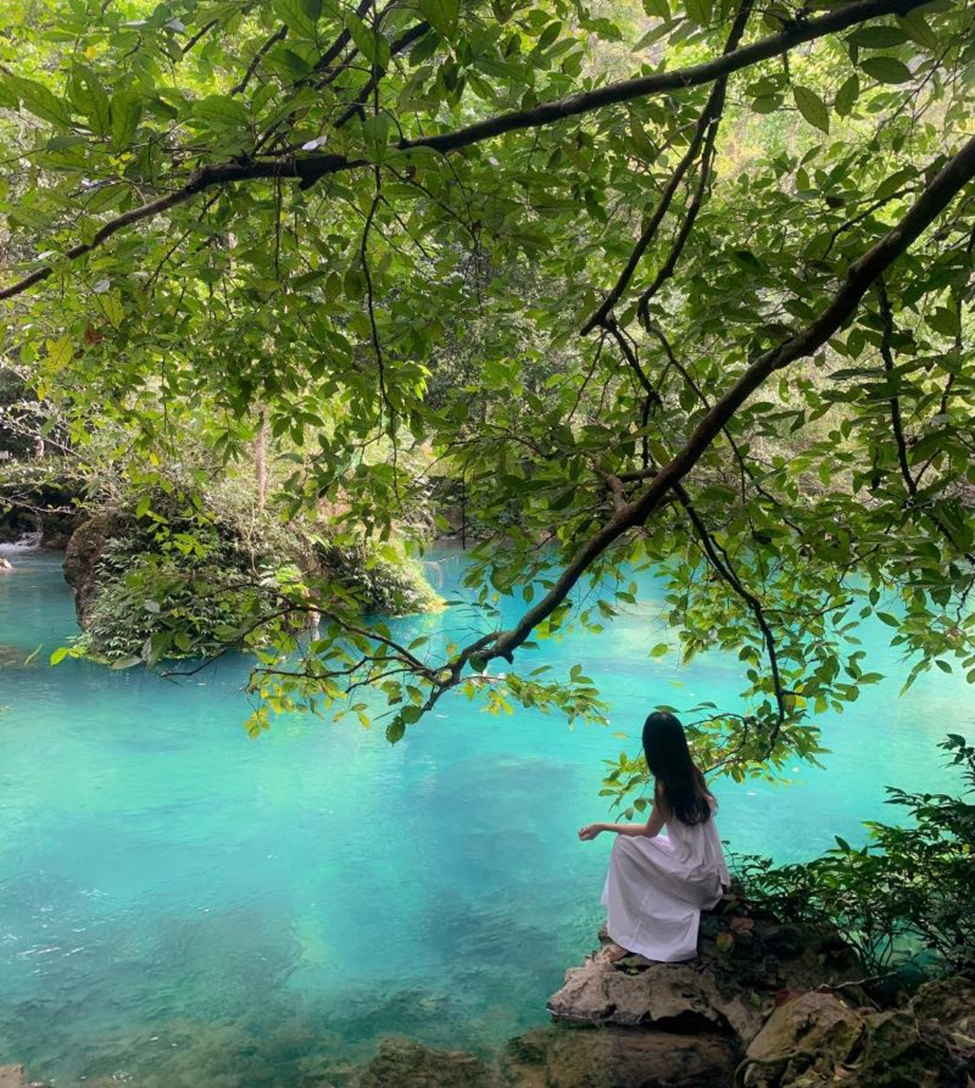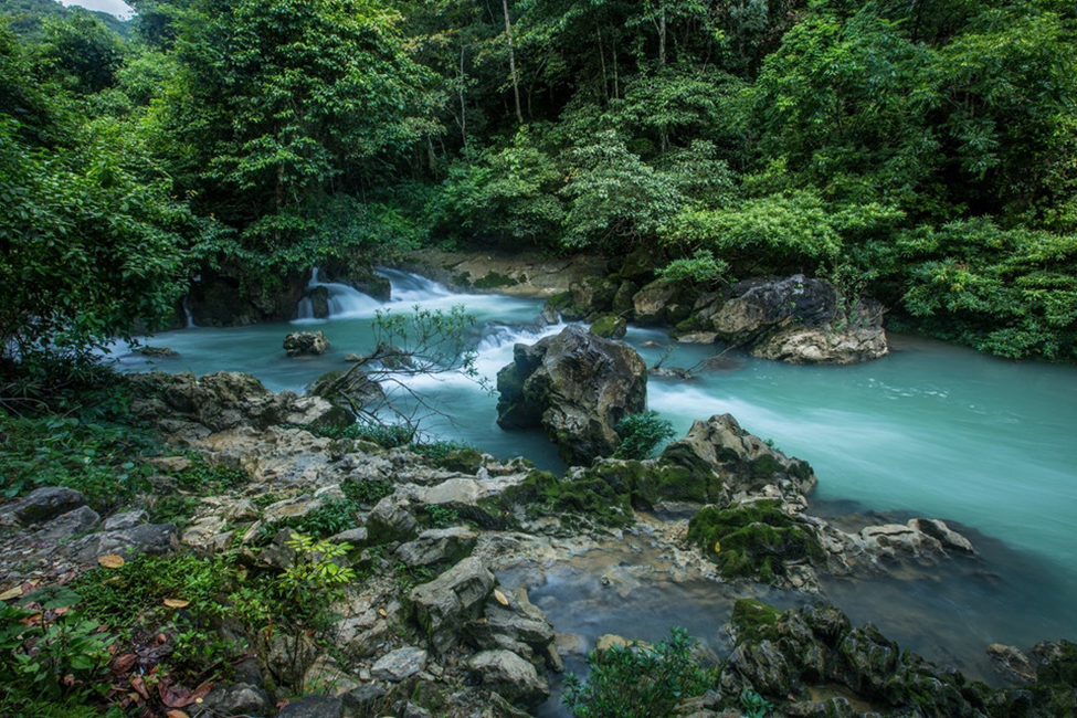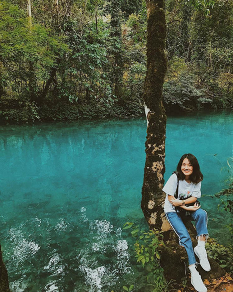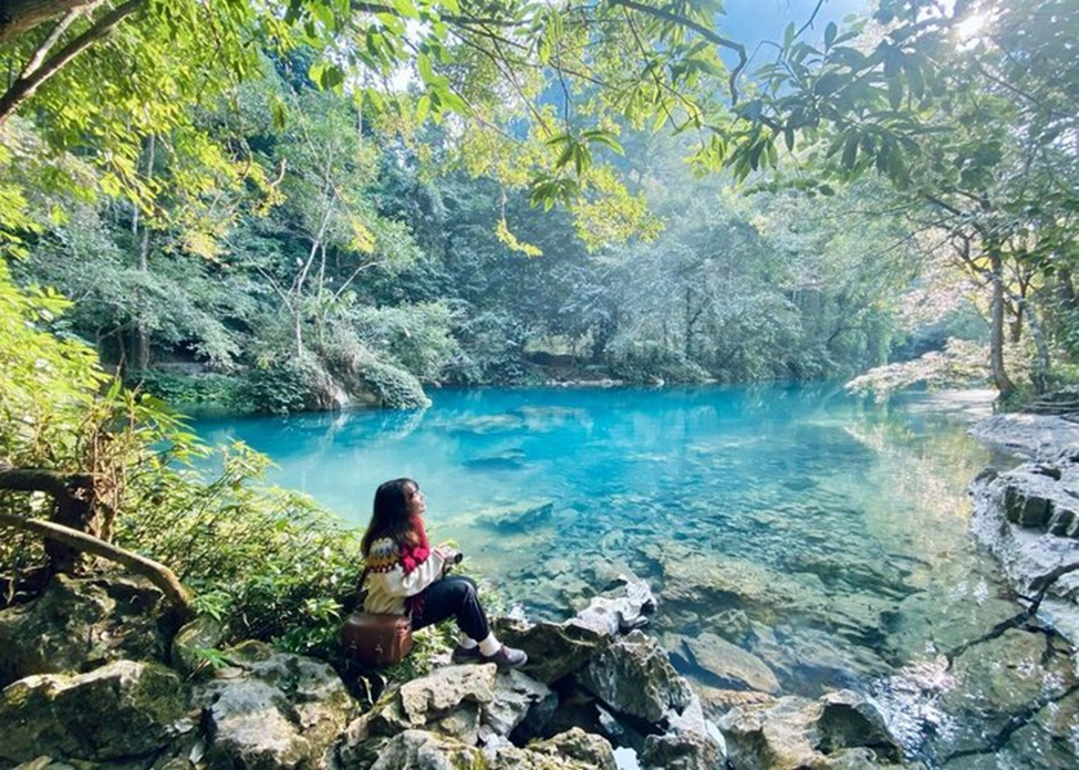 Điểm nhấn mê hoặc lòng người chính là màu nước xanh ngọc bích trong vắt, phản chiếu bầu trời và núi rừng, tạo nên một vẻ đẹp hoang sơ, thanh bình đến lạ kỳ. Nguồn: Mia.vn
